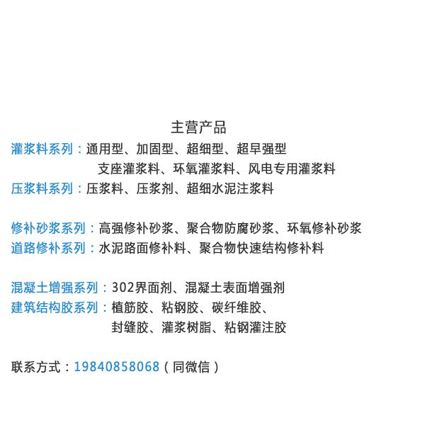 大家好,本公司主做特种加固材料,c40-c120高强度混凝土,灌浆料,特种砂浆,各类胶,外加剂,防腐防水涂料。