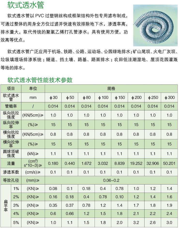 软式透水管是一种新型地下排水材料,软式透水管主要应用于:各类挡土墙背面垂直及水平排水;公路、铁路路基及路肩,软土地基排水;隧道、地下道的排水;电力灰坝及水利坝体的排水;室外运动场地的排水;横向水平钻孔排水;易崩滑地排水护坡;屋顶花园及花台排水;山坡地水土保持;整地工程的地下排水;低洼地排水及盐碱地改造系统。江苏透水管价格
