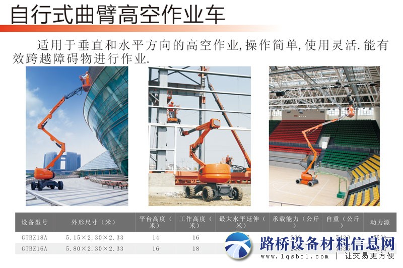 2、16米曲臂高空车:平台高度16米,工作高度18米,水平延伸8.85米,承载能力230公斤;