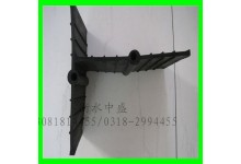 在绑扎钢筋之前应在垫层上或下层混凝土上弹出伸缩缝定位线,以确定伸缩缝位置;钢筋绑扎完成后放置止水带,止水带两端用定位钢筋和扁钢固定,用扁钢将止水带两端加紧并与结构钢筋或定位钢筋焊接;扁钢用一定间距的螺栓固定以保证止水带中间空心圆环与变形缝中心重合,同时止水带两端应微微翘起与中间空心圆环成15°~30°水平夹角,便于浇筑混凝土时排出内部空气;对垂直设置的止水带应在定型钢筋上绑扎一定间距的混凝土垫块固定,并要保持其界面部位平展;为保证水平橡胶止水带的中心标高,应在模板上弹出控制线,并在底板钢筋处点焊有止水环的钢筋棍以用来检查标高;一般采用从底部控制线位置处吊线坠的方法来控制垂直橡胶止水带的垂直度。