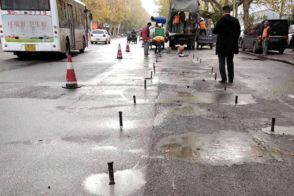 施工流程:管线探测仪探测道路及管线情况→注浆前弯沉检测→根据设计图纸编制专项施工方案→孔位布置→钻机开孔→注浆平台注浆→观察控制路面抬高→封堵冒浆孔→封孔→养生→雷达、弯沉检测→验收。