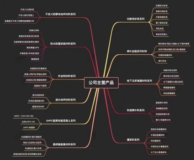 防水防腐涂装材料、外加剂材料、透水地坪材料、UHPC超高性能混凝土系列、路桥隧基建材料系列、功能性砂浆系、修补加固系列、地下注浆堵漏材料、快速修补料、灌浆料